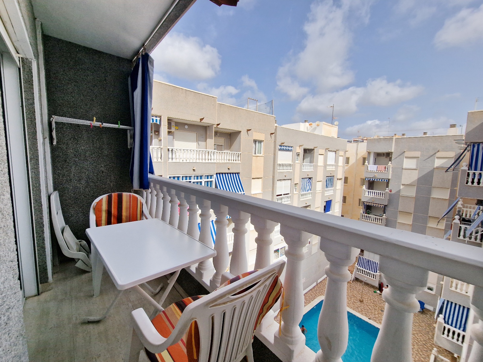 The terrace is accessed direclty from both the living room or from the bedroom and overlooks the communual swimming pool.