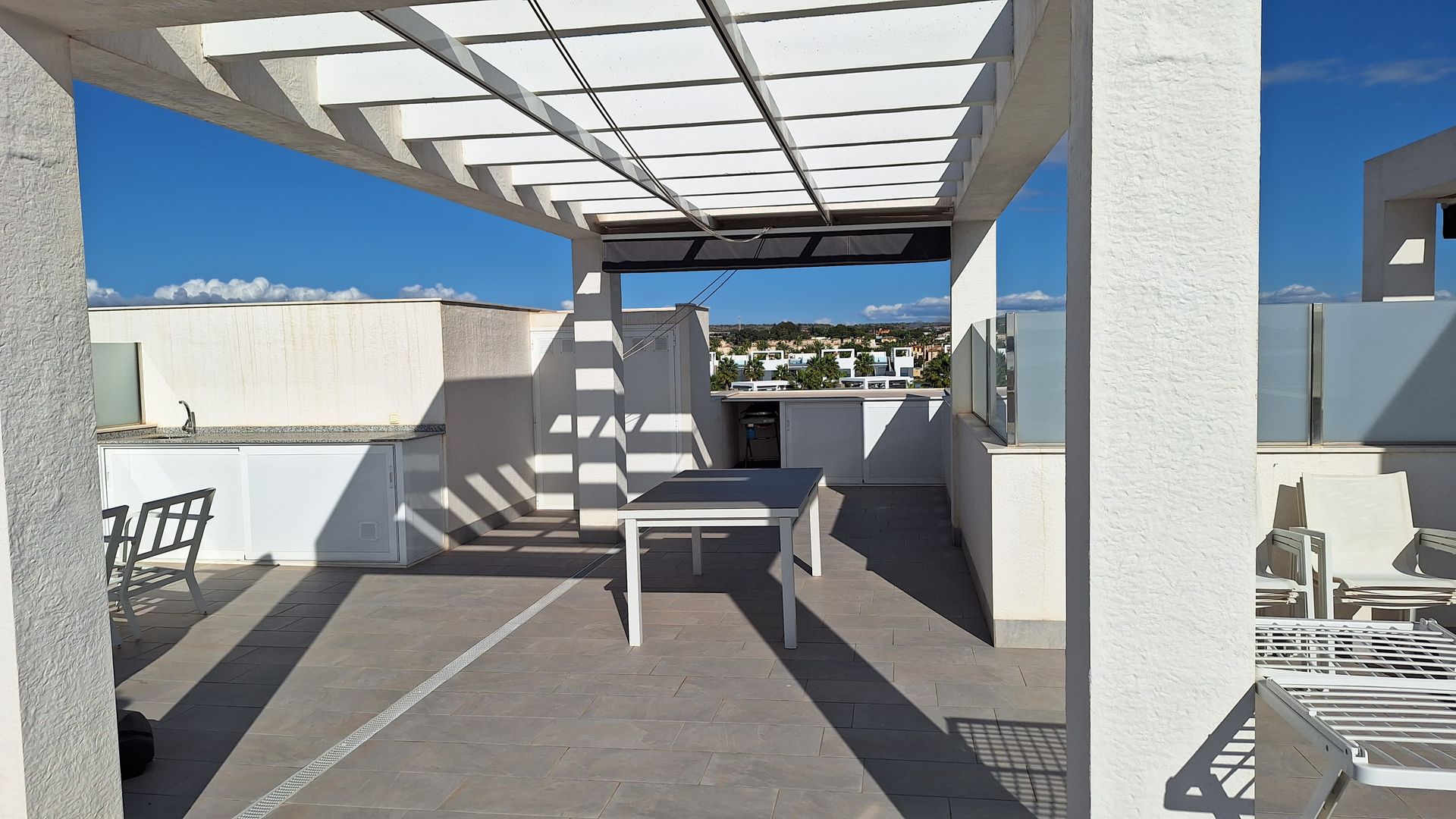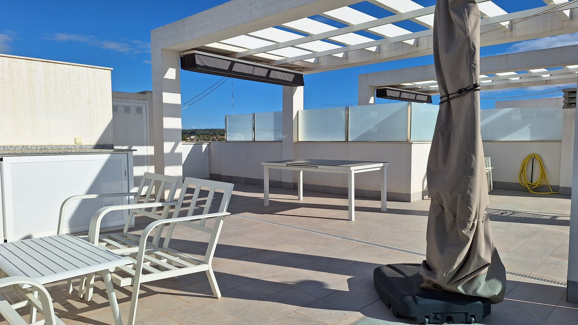 Step outside and unwind in your private roof solarium offering beautiful views, an outdoor cooking area, and a closed-in shaded section for relaxing or entertaining.
