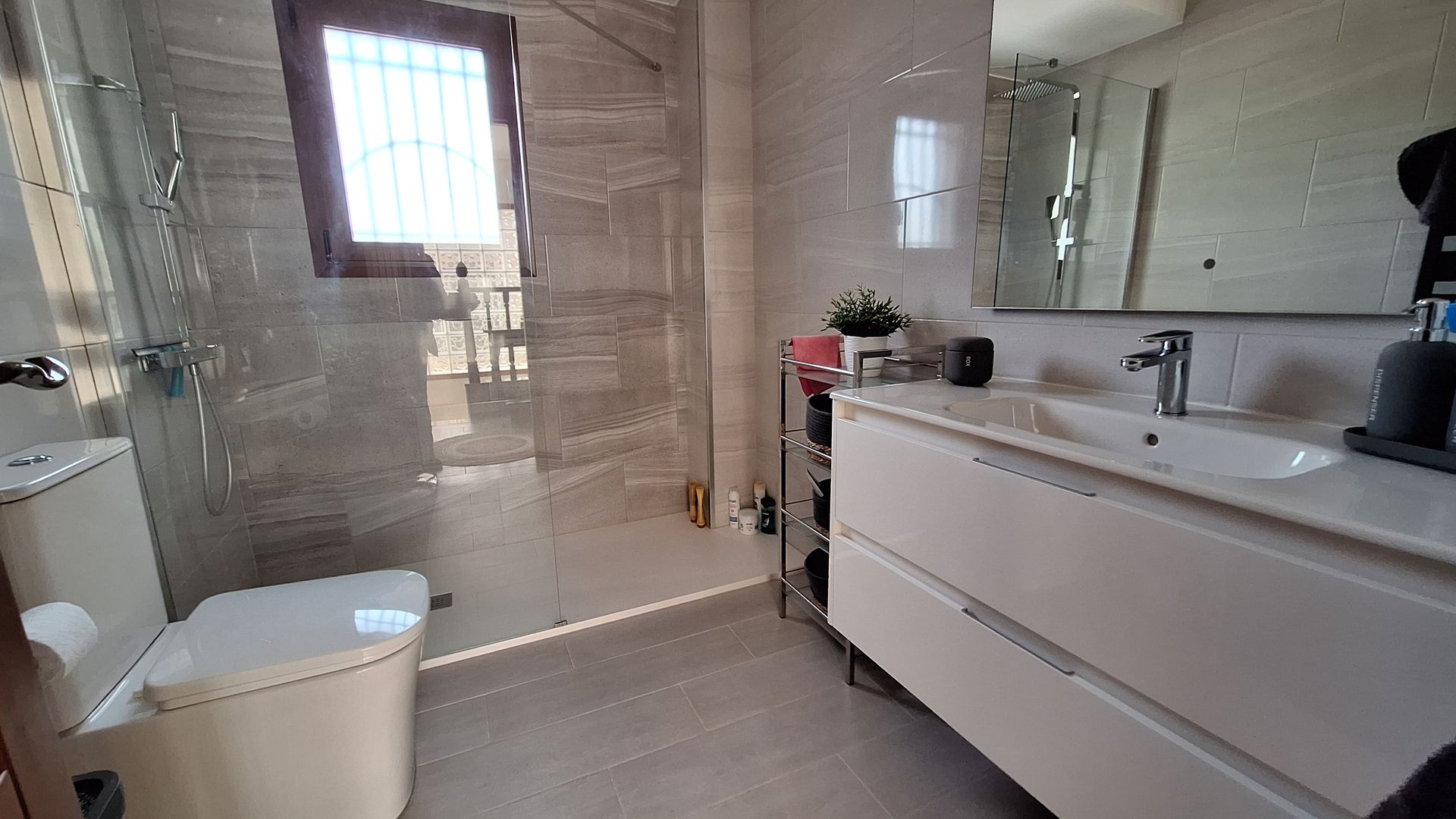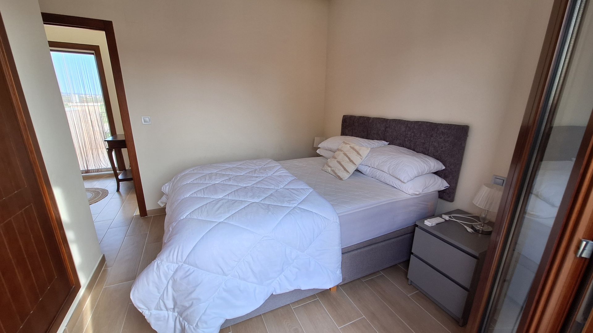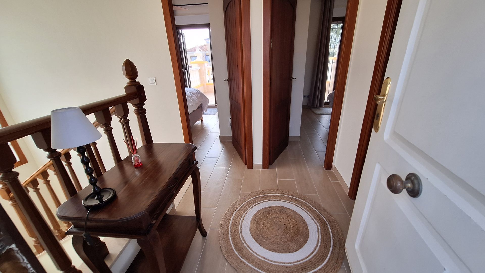 Ascending the bright and elegant staircase, a striking glass-brick feature window floods the upper floor with natural light. The upper level offers two further spacious bedrooms, each benefiting from double-glazed doors opening onto a substantial front terrace, ideal for morning coffee or evening relaxation. A beautifully appointed family bathroom completes this level.