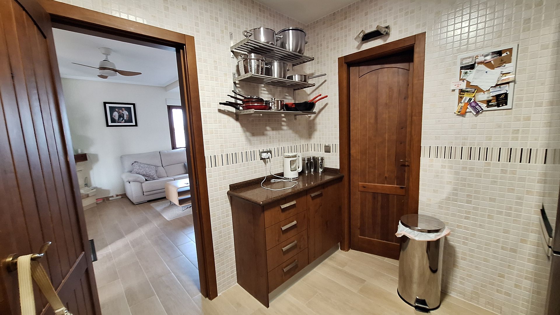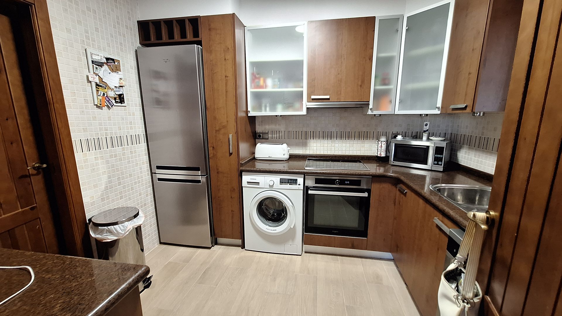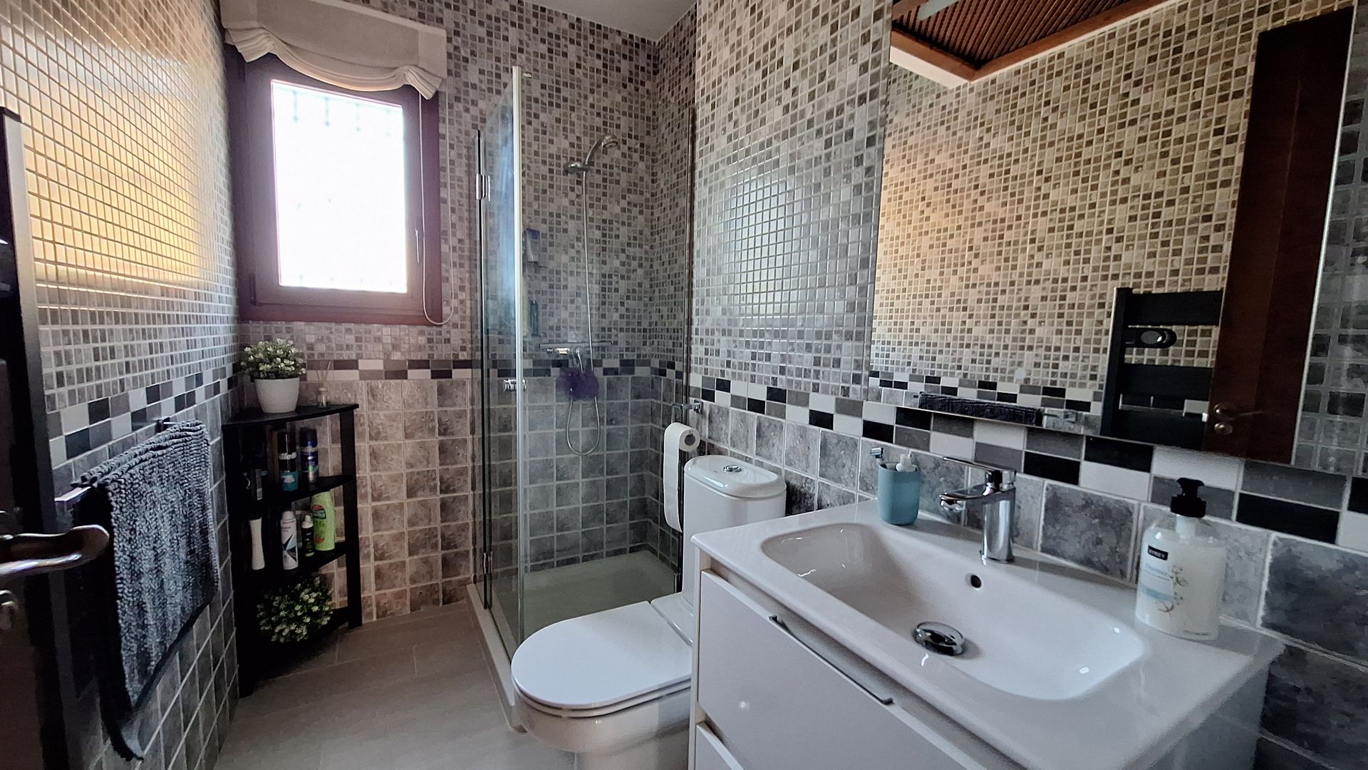 Ascending the bright and elegant staircase, a striking glass-brick feature window floods the upper floor with natural light. The upper level offers two further spacious bedrooms, each benefiting from double-glazed doors opening onto a substantial front terrace, ideal for morning coffee or evening relaxation. A beautifully appointed family bathroom completes this level.
