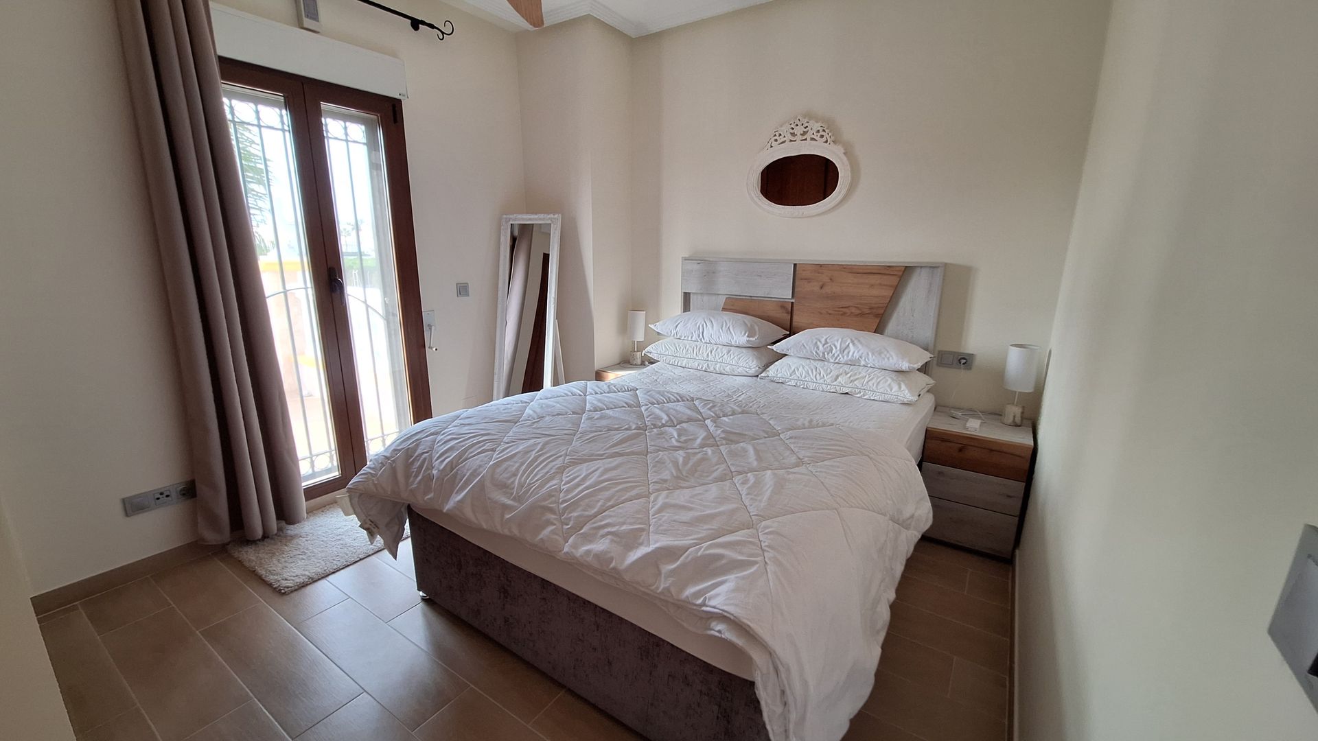 Inside, the villa impresses with a large, light-filled lounge, thoughtfully designed for modern living, complemented by a separate, fully equipped kitchen. The ground floor also features two generously sized bedrooms and a luxurious family bathroom, offering flexibility for guests or single-level living.